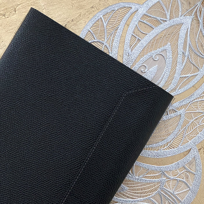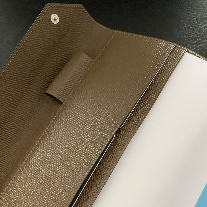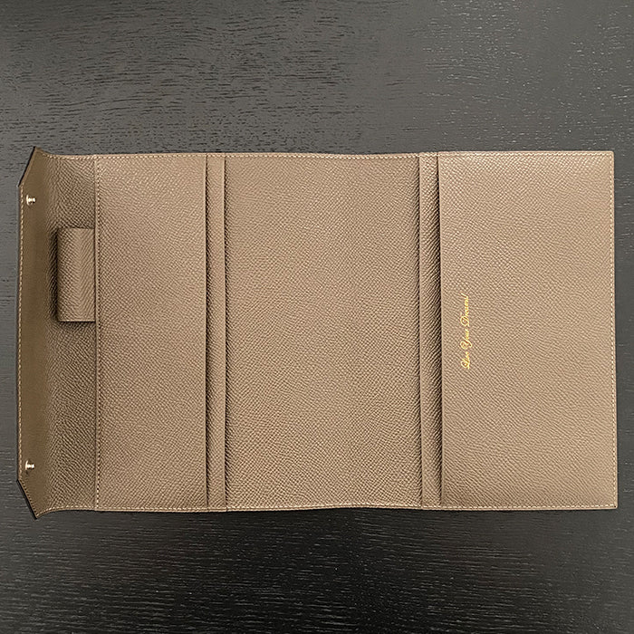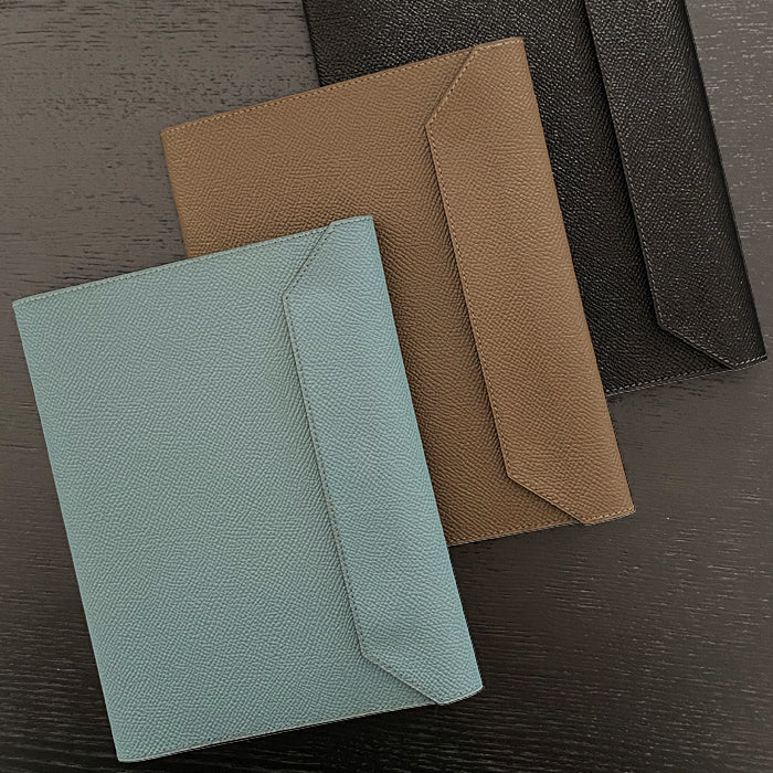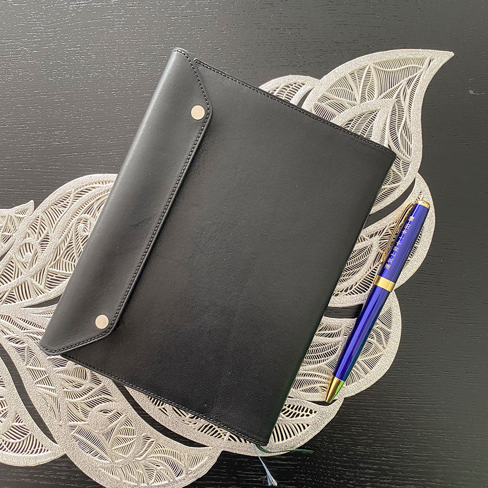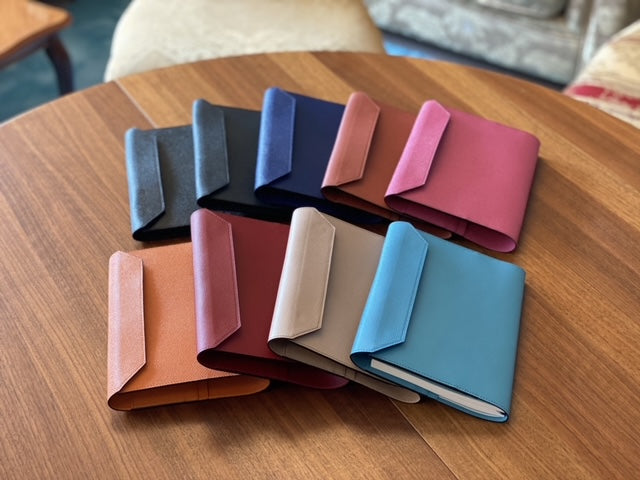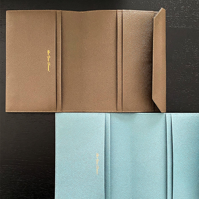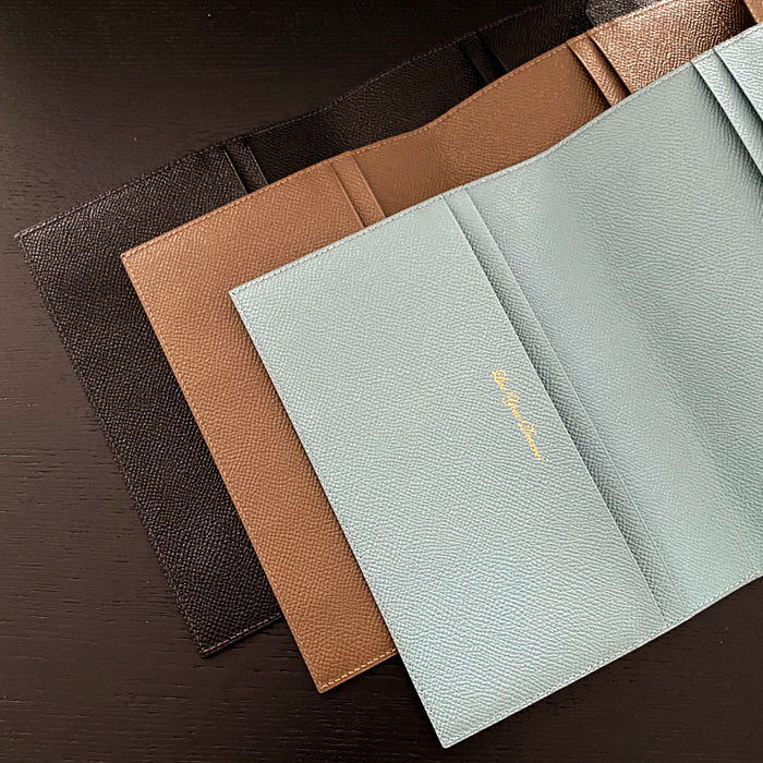 創業明治39年(1906)。多くの有名百貨店やブランドの革製品を手掛ける一流メゾンである博庵(HIROAN)に依頼し、本革の手帳カバーを製作しました。こちらの職人さんの技でもある薄く貼り合わせた革素材は軽いのに、しなやかで強度が強いという特徴があります。