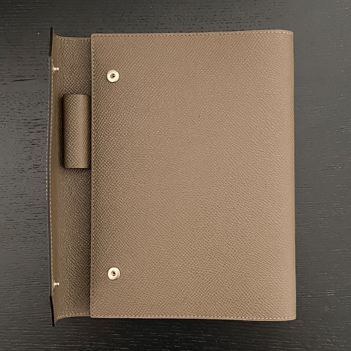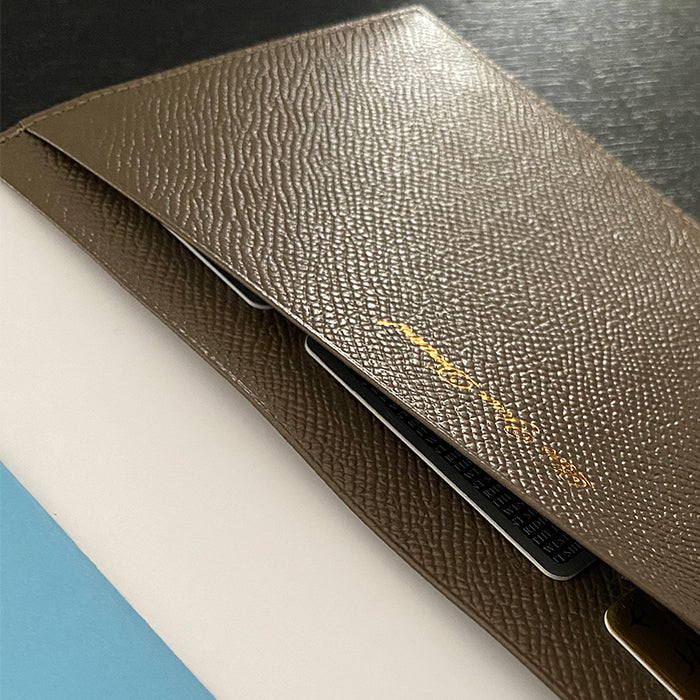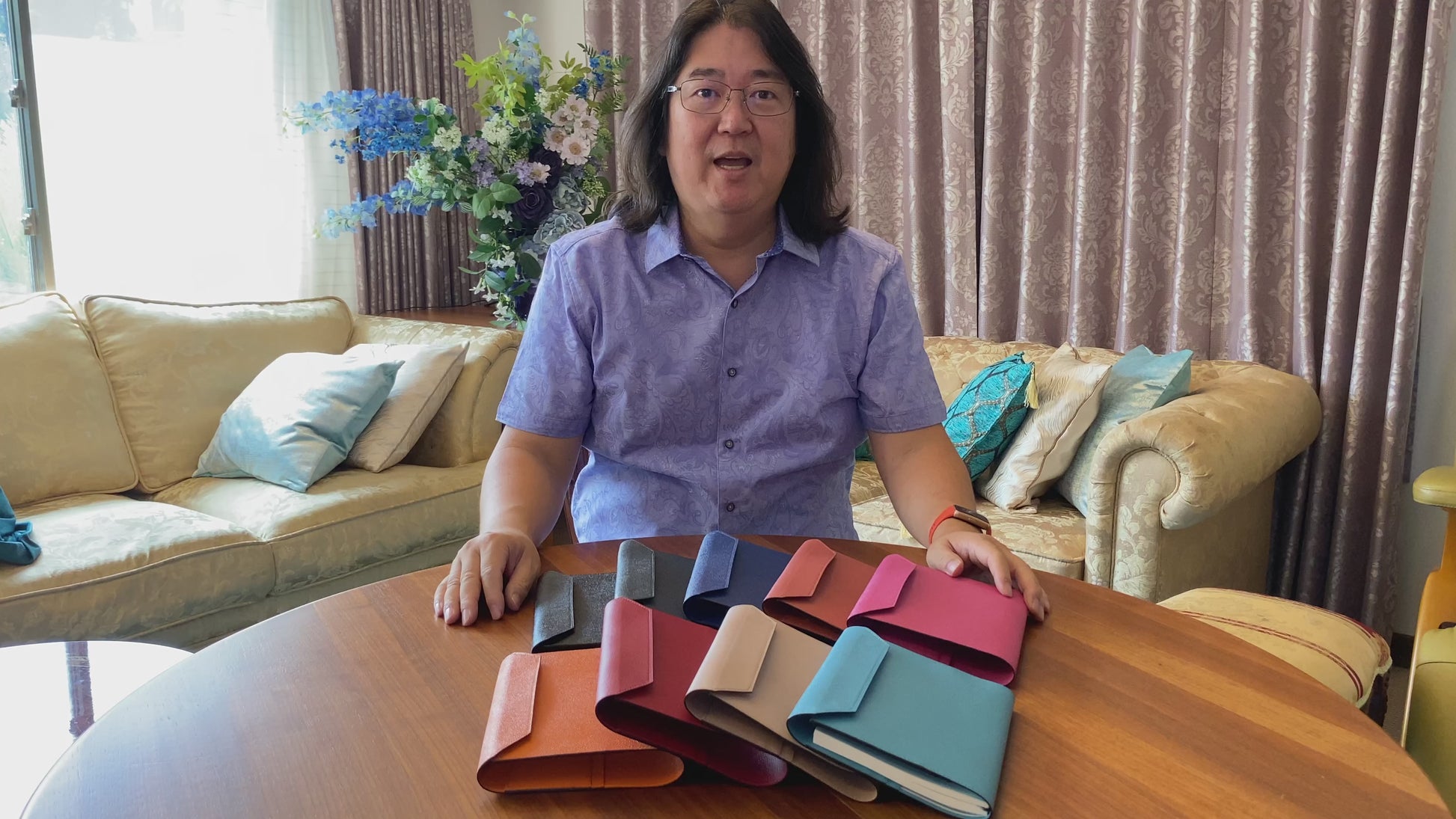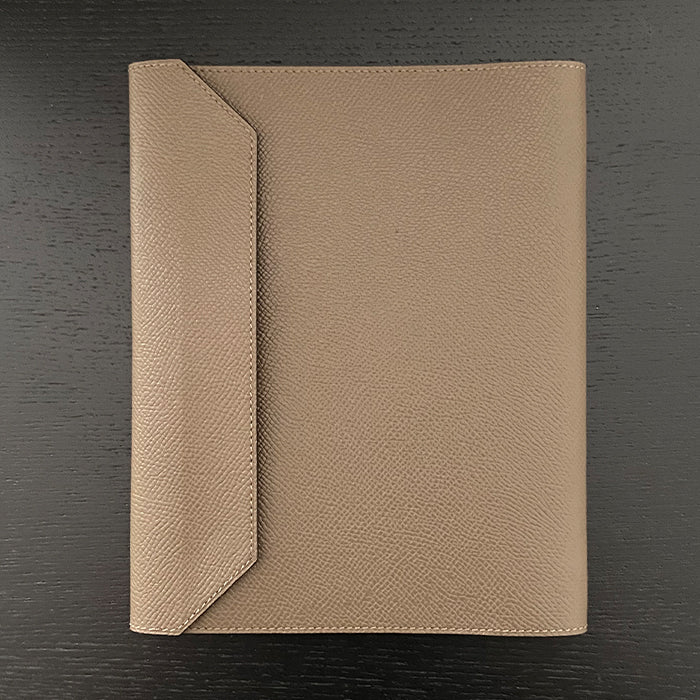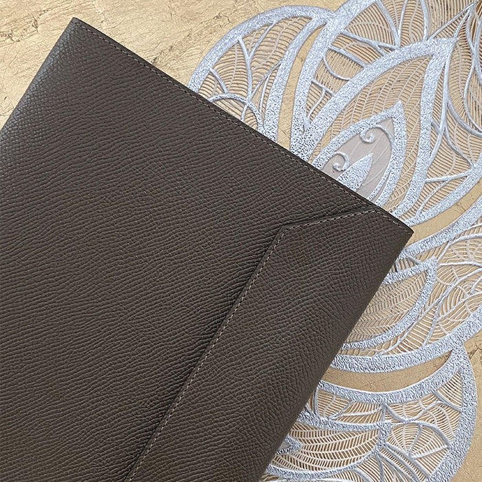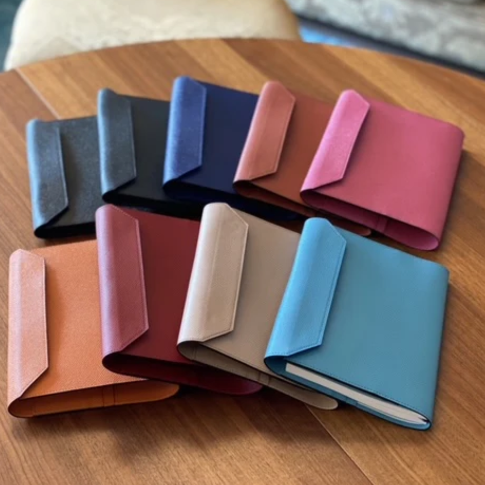 創業明治39年(1906)。多くの有名百貨店やブランドの革製品を手掛ける一流メゾンである博庵(HIROAN)に依頼し、本革の手帳カバーを製作しました。こちらの職人さんの技でもある薄く貼り合わせた革素材は軽いのに、しなやかで強度が強いという特徴があります。